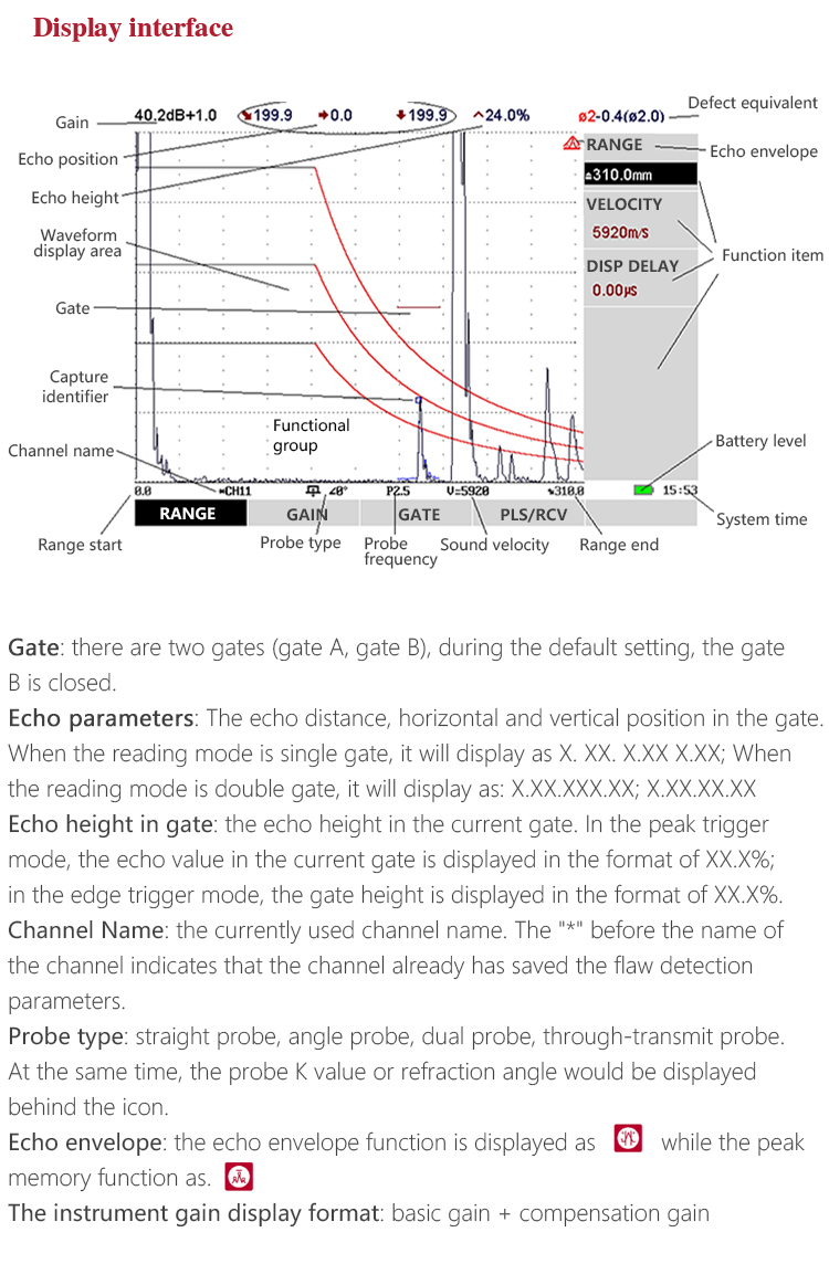 Gate position, gate width and gate height can be adjustable at will. The B gate can chose to set wave-getting alarm or wave-losing alarm. The beep in gate and LED light can be alarmed or closed (the LED light alarm is very effective under the noise environment). The capture mark function can show the captured echo characteristics in the gate.
