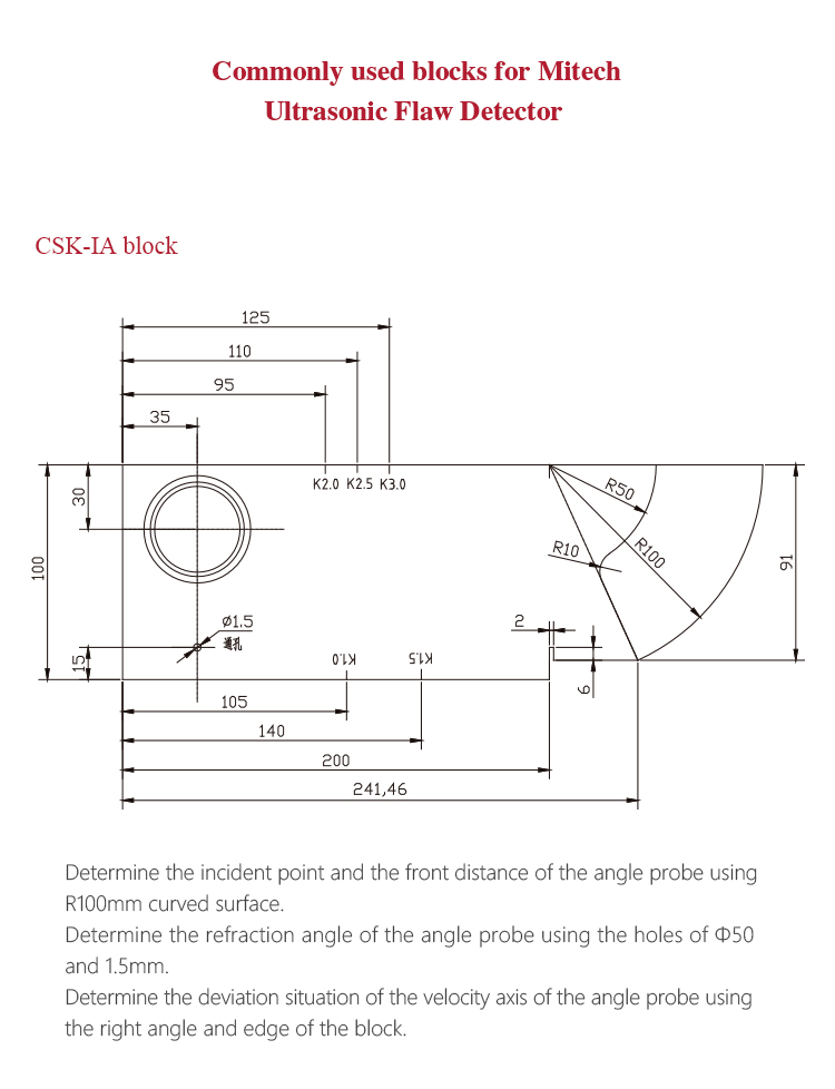 | Mitech standard Ultrasonic flaw detector Angle Probe with the parameters of 4MHz 8*9, 60°is the standard configuration. It is mainly composed of the piezoelectric crystal, damping block and wedge. The ultrasonic wave emitted from the crystal, through the wedge, it is converted to the transverse wave, and then incident to the measured workpiece. The wedge is made of organic glass, which can realize the waveform transformation. In order to avoid errors in calculating the defect distance, before using the angle probe, we need to calibrate its P-delay, angle and forefront. Through calibration, this part of the error can be automatically subtracted, thus improving the measurement accuracy .The Angle Beam Probe is suitable for normal flaw detecting like welds. | |