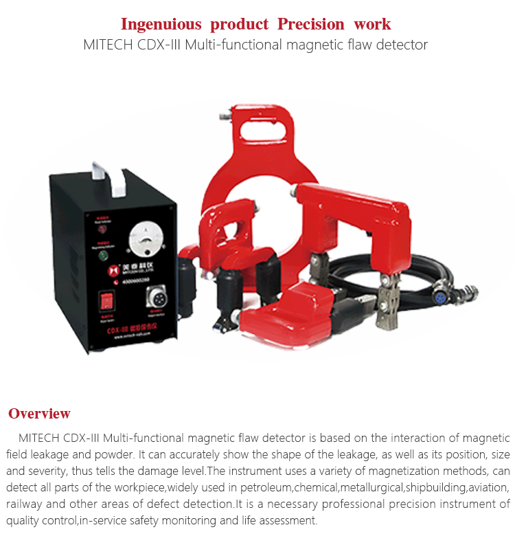 Product OverviewMITECH CDX-Ⅲ multifunctional magnetic particle flaw detector is the self-designed magnetic participle flaw detector of MITECH CO.,LTD. With small size, light weight, easy operation, multifunction in one unit. The detector can equip A, D, E O four types of probes to realize the functions of magnetic clamp detection, electromagnetic yoke detection, cross magnetic yoke detection, ring detection. It is the necessary detector to do quality control, safety check, life evaluation in the fields of petrol, chemicals, metallurgy, shipbuilding, aviation, railway etc