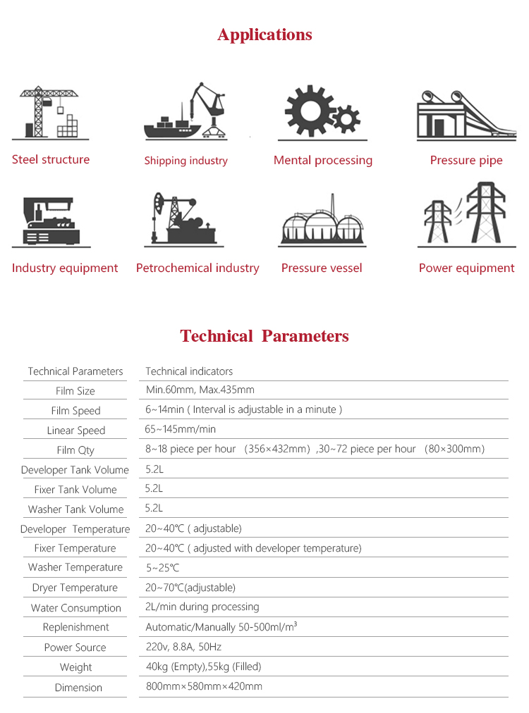 Working PrincipleFilm process mainly by developing, fixing, washing and drying. The film needs to be placed in the developer tank that with liquid for a period of time, then in the fixer tank for a period of time. After that, put it in wash tank, then dry it to complete the film process.