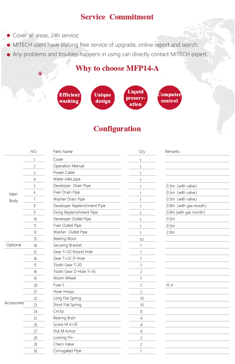 Product OverviewMFP14-A fully automatic film processor is the new generation product of Mitech Co.Ltd. With Super digital display board, the microcomputer control system and dense array type roller group, it can transfer various size film. Gap bridge direction can be adjusted to avoid film stuck. Processing liquid can automatically cycle and replenish to keep the liquids fresh. Professional prototype drying air duct system makes both sides of the film dried with no water print. It is widely used for monitoring various pipelines and pressure vessels in the fields of petroleum, chemical, metallurgy, shipbuilding, aviation, aerospace and so on