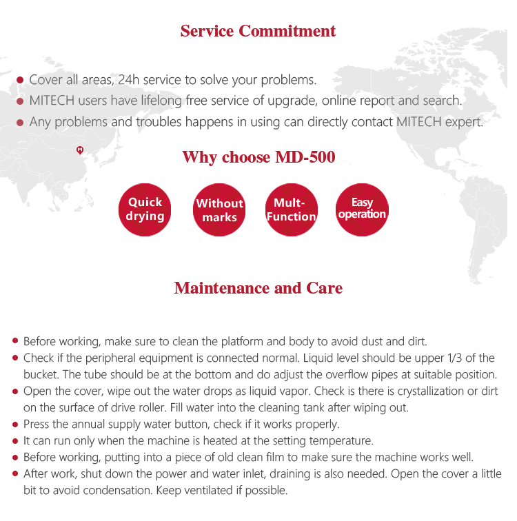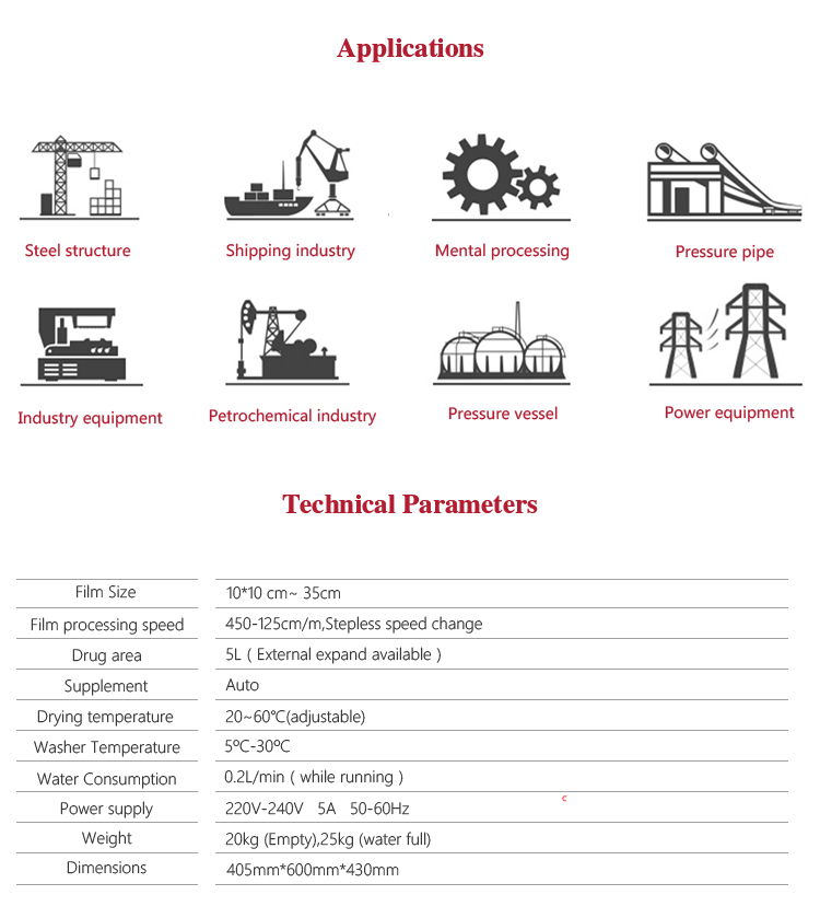 Product OverviewMITECH Film auto-dry machine MD-500 is mainly used to quickly dry the film after ray detection. It adopts PU roller and soft rubber roller to convey film. Together with good water absorption sponge shaft, it can quickly and efficiently dry the film without water and damage. Multi-functional as it is, the spinning speed is adjustable and thus makes it convenient to operate.The film can be washed again by external water source or inner water sink. The circulation pump makes it possible to supply clean water when necessary. In a word, MD-500 is the necessary equipment for ray detection.