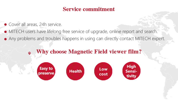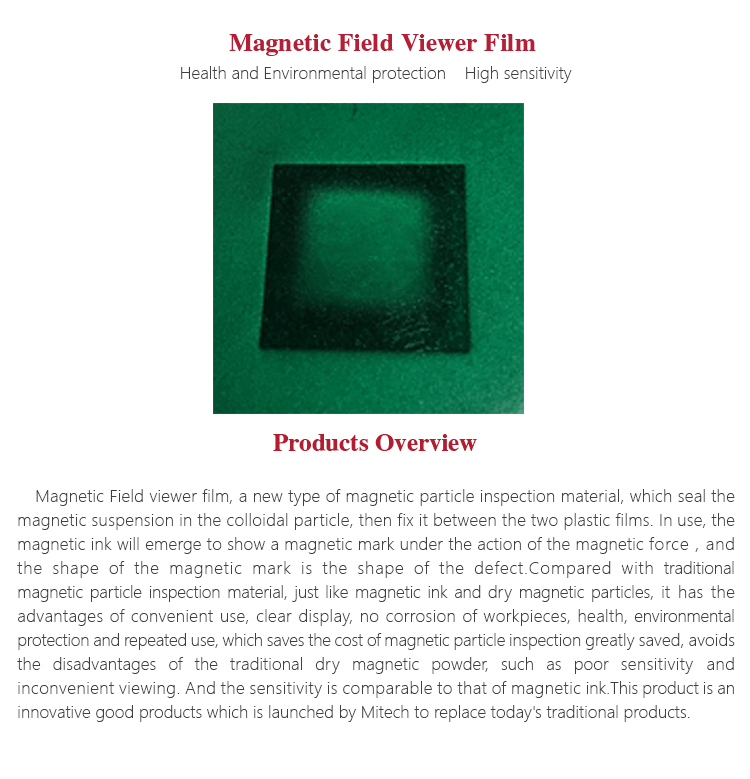 Magnetic Field viewer film, a new type of magnetic particle inspection material, which seal the magnetic suspension in the colloidal particle, then fix it between the two plastic films. In use, the magnetic ink will emerge to show a magnetic mark under the action of the magnetic force , and the shape of the magnetic mark is the shape of the defect.Compared with traditional magnetic particle inspection material, just like magnetic ink and dry magnetic particles, it has the advantages of convenient use, clear display, no corrosion of workpieces, health, environmental protection and repeated use, which saves the cost of magnetic particle inspection greatly saved, avoids the disadvantages of the traditional dry magnetic powder, such as poor sensitivity and inconvenient viewing. And the sensitivity is comparable to that of magnetic ink.This product is an innovative good products which is launched by Mitech to replace today's traditional products.