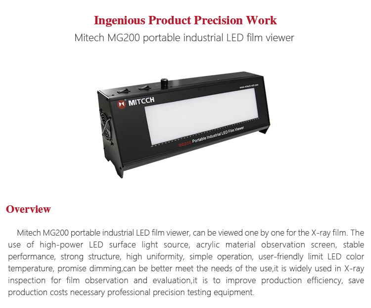 Product OverviewMitech MG200 portable industrial LED film viewer, can be viewed one by one for the X-ray film. The use of high-power LED surface light source, acrylic material observation screen, stable performance, strong structure, high uniformity, simple operation, user-friendly limit LED color temperature, promise dimming,can be better meet the needs of the use,it is widely used in X-ray inspection for film observation and evaluation,it is to improve production efficiency, save production costs necessary professional precision testing equipment