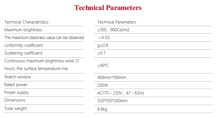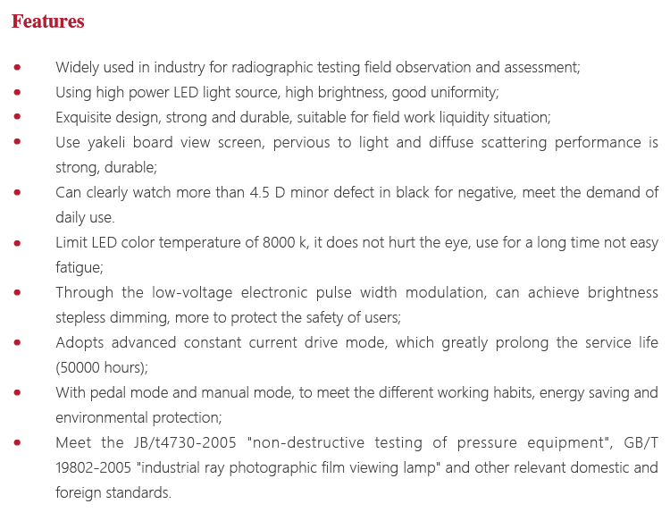 l Meet the JB/t4730-2005 "non-destructive testing of pressure equipment", GB/T 19802-2005 "industrial ray photographic film viewing lamp" and other relevant domestic and foreign standards