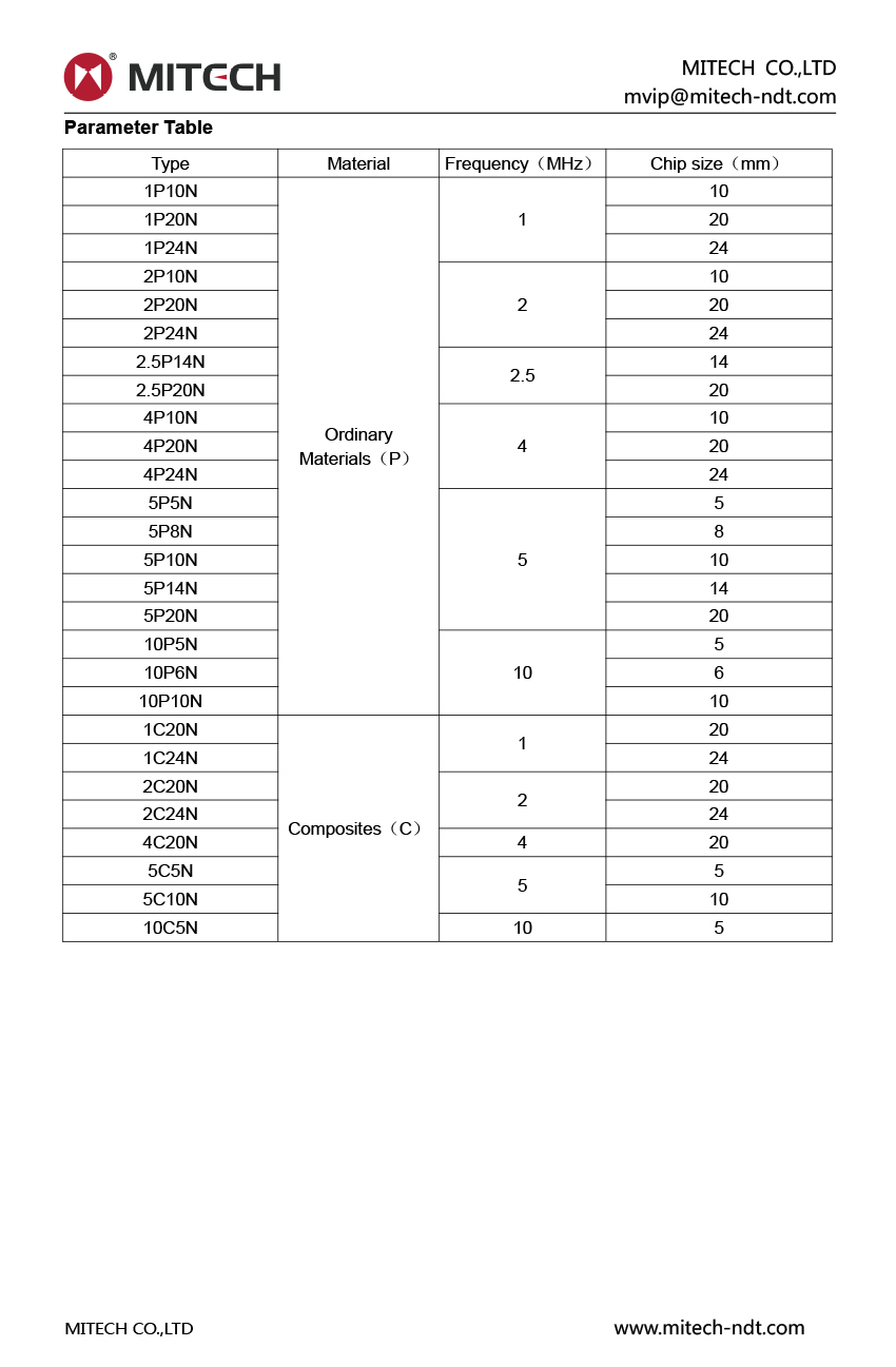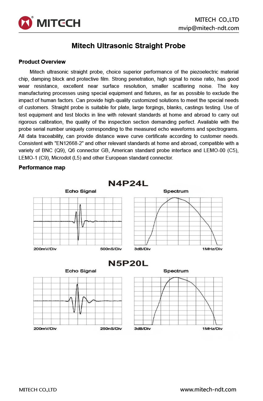 Mitech ultrasonic straight probe, choice superior performance of the piezoelectric material chip, damping block and protective film. Strong penetration, high signal to noise ratio, has good wear resistance, excellent near surface resolution, smaller scattering noise. The key manufacturing processes using special equipment and fixtures, as far as possible to exclude the impact of human factors. Can provide high-quality customized solutions to meet the special needs of customers. Straight probe is suitable for plate, large forgings, blanks, castings testing. Use of test equipment and test blocks in line with relevant standards at home and abroad to carry out rigorous calibration, the quality of the inspection section demanding perfect. Available with the probe serial number uniquely corresponding to the measured echo waveforms and spectrograms. All data traceability, can provide distance wave curve certificate according to customer needs. Consistent with "EN12668-2" and other relevant standards at home and abroad, compatible with a variety of BNC (Q9), Q6 connector GB, American standard probe interface and LEMO-00 (C5), LEMO-1 (C9), Microdot (L5) and other European standard connector.