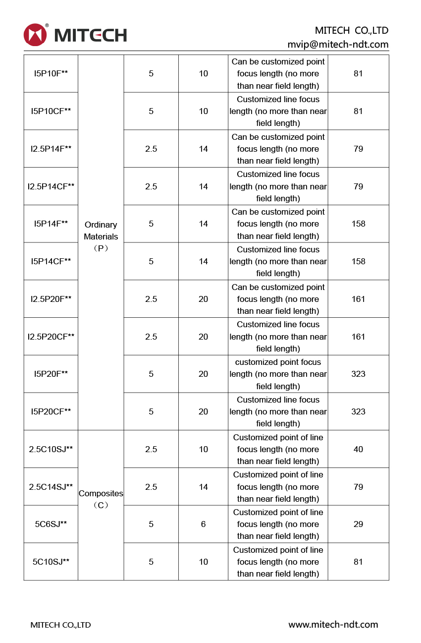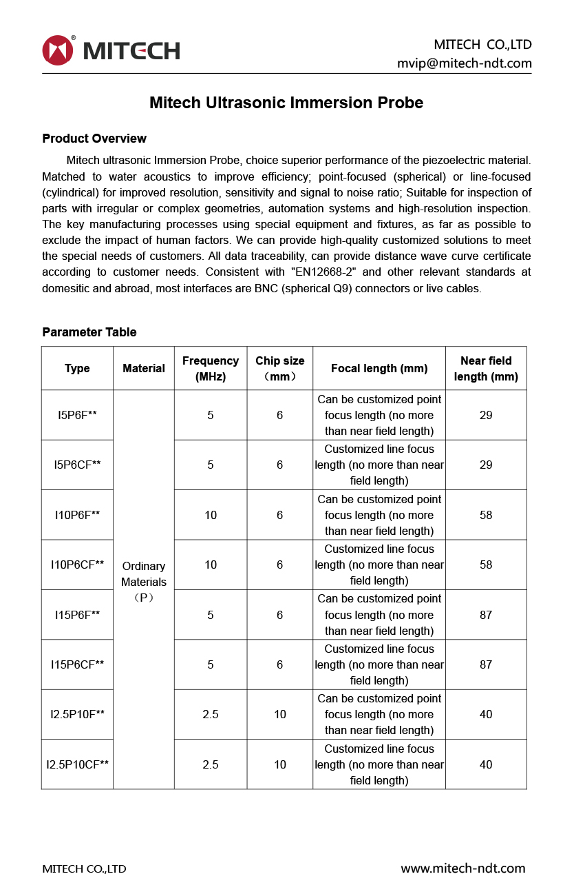 Product OverviewMitech ultrasonic Immersion Probe, choice superior performance of the piezoelectric material. Matched to water acoustics to improve efficiency; point-focused (spherical) or line-focused (cylindrical) for improved resolution, sensitivity and signal to noise ratio; Suitable for inspection of parts with irregular or complex geometries, automation systems and high-resolution inspection. The key manufacturing processes using special equipment and fixtures, as far as possible to exclude the impact of human factors. We can provide high-quality customized solutions to meet the special needs of customers. All data traceability, can provide distance wave curve certificate according to customer needs. Consistent with "EN12668-2" and other relevant standards at domesitic and abroad, most interfaces are BNC (spherical Q9) connectors or live cables.