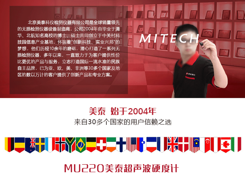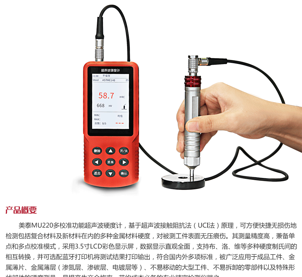 產(chǎn)品概述 美泰MU220多校準功能超聲波硬度計,基于超聲波接觸阻抗法(UCI法)原理,可方便快捷無損傷地檢測包括復(fù)合材料及新材料在內(nèi)的多種金屬材料硬度,對被測工件表面無壓痕傷。其測量精度高,兼?zhèn)鋯吸c和多點校準模式,采用3.5寸LCD彩色顯示屏,數(shù)據(jù)顯示直觀全面,支持布、洛、維等多種硬度制氏間的相互轉(zhuǎn)換,并可選配藍牙打印機將測試結(jié)果打印輸出,符合國內(nèi)外多項標準,被廣泛應(yīng)用于成品工件、金屬薄片、金屬薄層(滲氮層、滲碳層、電鍍層等)、不易移動的大型工件、不易拆卸的零部件以及特殊形狀部件的硬度測量,是提高生產(chǎn)合格率、節(jié)約成本必備的專業(yè)精密檢測儀器之一。