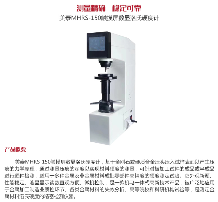 產(chǎn)品概述美泰MHRS-150觸摸屏數(shù)顯洛氏硬度計,基于金剛石或硬質(zhì)合金壓頭壓入試樣表面以產(chǎn)生壓痕的力學(xué)原理,通過測量壓痕的深度以實現(xiàn)材料硬度的測量,可針對被加工試件的成品或半成品進行逐件檢測,適用于多種金屬及非金屬材料成批零部件高精度的硬度測定試驗。它外觀新穎、性能穩(wěn)定、液晶顯示讀數(shù)直觀方便、微機控制,是一款機電一體式高新技術(shù)產(chǎn)品,被廣泛地應(yīng)用于金屬加工制造業(yè)質(zhì)控環(huán)節(jié)、各類金屬材料的失效分析、高等院校和科研機構(gòu)試驗等,是測定金屬材料洛氏硬度的精密檢測儀器。