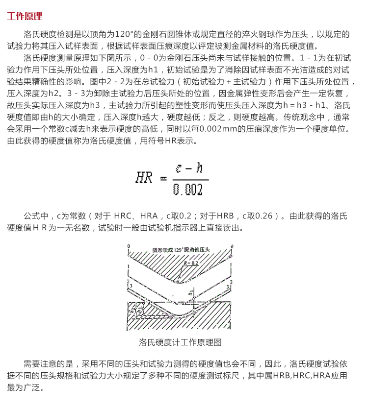 公式中,c為常數(shù)(對于 HRC、HRA,c取0.2;對于HRB,c取0.26)。由此獲得的洛氏硬度值HR為一無名數(shù),試驗時一般由試驗機指示器上直接讀出。