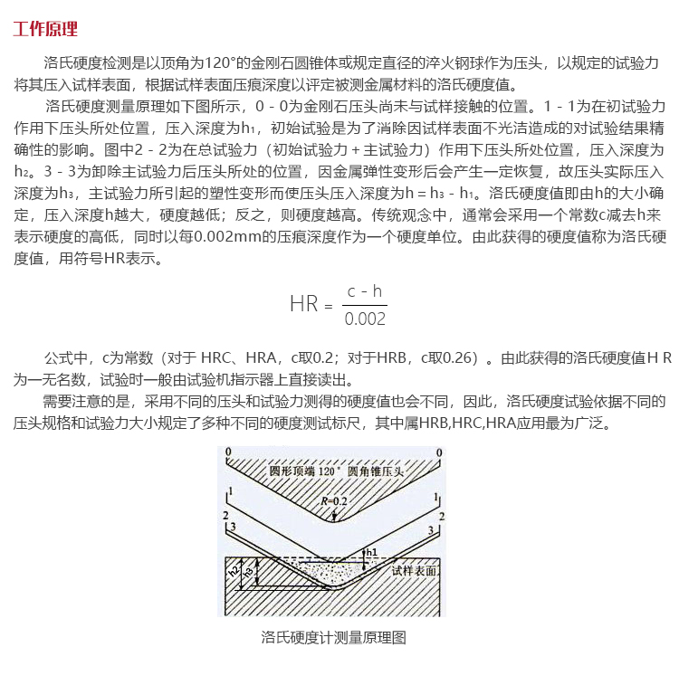 公式中,c為常數(shù)(對(duì)于 HRC、HRA,c取0.2;對(duì)于HRB,c取0.26)。由此獲得的洛氏硬度值HR為一無(wú)名數(shù),試驗(yàn)時(shí)一般由試驗(yàn)機(jī)指示器上直接讀出。