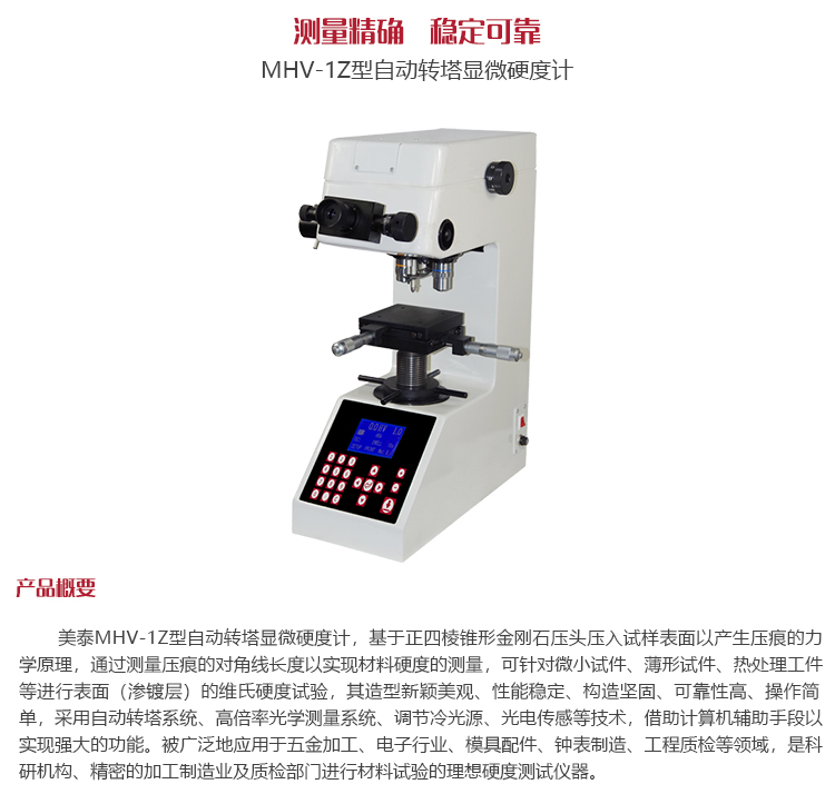 產(chǎn)品概述美泰MHV-1Z型自動轉(zhuǎn)塔顯微硬度計(jì),基于正四棱錐形金剛石壓頭壓入試樣表面以產(chǎn)生壓痕的力學(xué)原理,通過測量壓痕的對角線長度以實(shí)現(xiàn)材料硬度的測量,可針對微小試件、薄形試件、熱處理工件等進(jìn)行表面(滲鍍層)的維氏硬度試驗(yàn),其造型新穎美觀、性能穩(wěn)定、構(gòu)造堅(jiān)固、可靠性高、操作簡單,采用自動轉(zhuǎn)塔系統(tǒng)、高倍率光學(xué)測量系統(tǒng)、調(diào)節(jié)冷光源、光電傳感等技術(shù),借助計(jì)算機(jī)輔助手段以實(shí)現(xiàn)強(qiáng)大的功能。被廣泛地應(yīng)用于五金加工、電子行業(yè)、模具配件、鐘表制造、工程質(zhì)檢等領(lǐng)域,是科研機(jī)構(gòu)、精密的加工制造業(yè)及質(zhì)檢部門進(jìn)行材料試驗(yàn)的理想硬度測試儀器。