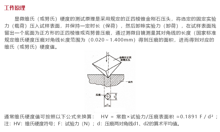 通常維氏硬度值可按照以下公式來換算: HV = 常數(shù)×試驗(yàn)力/壓痕表面積 ≈0.1891 F/d2 ;