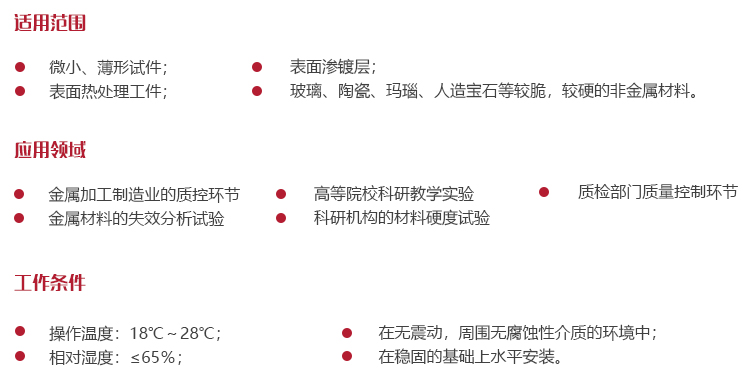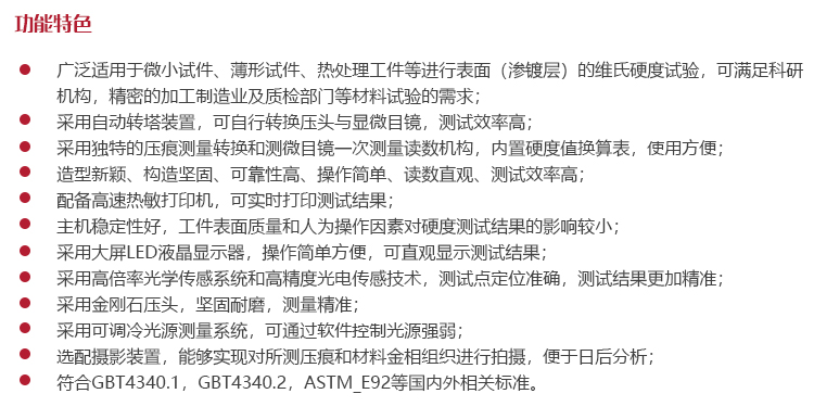 儀器特點(diǎn)廣泛適用于微小試件、薄形試件、熱處理工件等進(jìn)行表面(滲鍍層)的維氏硬度試驗(yàn),可滿足科研機(jī)構(gòu),精密的加工制造業(yè)及質(zhì)檢部門等材料試驗(yàn)的需求;