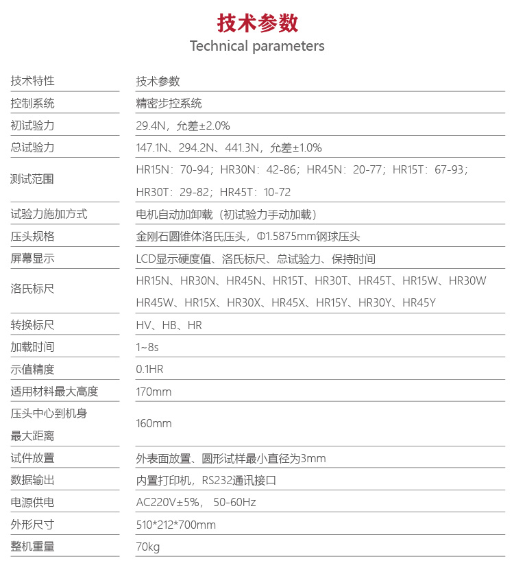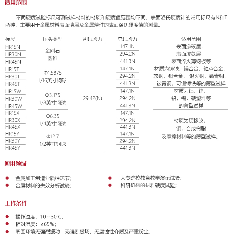 | 測試范圍 | HR15N:70-94;HR30N:42-86;HR45N:20-77;HR15T:67-93;HR30T:29-82;HR45T:10-72 |