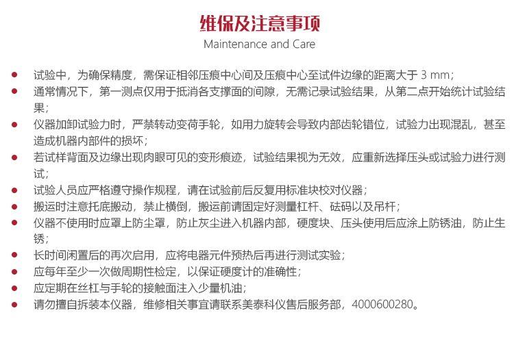 儀器的保養(yǎng)與維護?試驗中,為確保精度,需保證相鄰壓痕中心間及壓痕中心至試件邊緣的距離大于 3 mm;