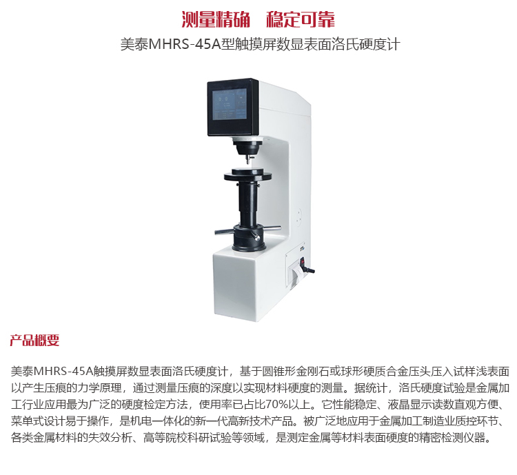 美泰MHRS-45A觸摸屏數(shù)顯表面洛氏硬度計,基于圓錐形金剛石或球形硬質(zhì)合金壓頭壓入試樣淺表面以產(chǎn)生壓痕的力學(xué)原理,通過測量壓痕的深度以實現(xiàn)材料硬度的測量。據(jù)統(tǒng)計,洛氏硬度試驗是金屬加工行業(yè)應(yīng)用最為廣泛的硬度檢定方法,使用率已占比70%以上。它性能穩(wěn)定、液晶顯示讀數(shù)直觀方便、菜單式設(shè)計易于操作,是機電一體化的新一代高新技術(shù)產(chǎn)品。被廣泛地應(yīng)用于金屬加工制造業(yè)質(zhì)控環(huán)節(jié)、各類金屬材料的失效分析、高等院??蒲性囼灥阮I(lǐng)域,是測定金屬等材料表面硬度的精密檢測儀器。