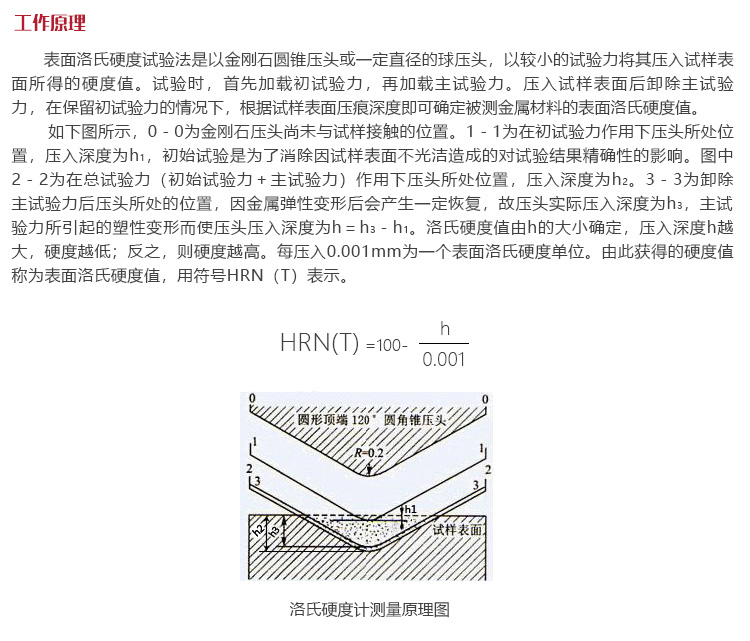 表面洛氏硬度試驗法是以金剛石圓錐壓頭或一定直徑的球壓頭,以較小的試驗力將其壓入試樣表面所得的硬度值。試驗時,首先加載初試驗力,再加載主試驗力。壓入試樣表面后卸除主試驗力,在保留初試驗力的情況下,根據(jù)試樣表面壓痕深度即可確定被測金屬材料的表面洛氏硬度值。