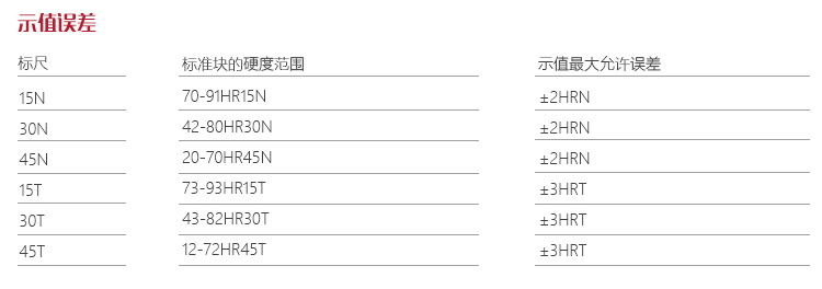 | 洛氏標(biāo)尺 | HR15N、HR30N、HR45N、HR15T、HR30T、HR45T、HR15W、HR30W HR45W、HR15X、HR30X、HR45X、HR15Y、HR30Y、HR45Y |