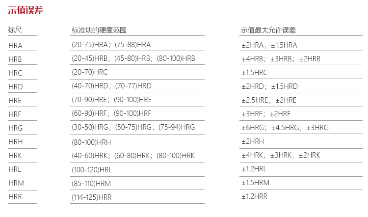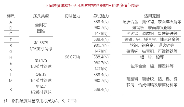 | 洛氏標尺 | HRA、HRB、HRC、HRD、HRE、HRF、HRG、HRH、HRK、HRL、HRM、HRP、HRR、HRS、HRV |