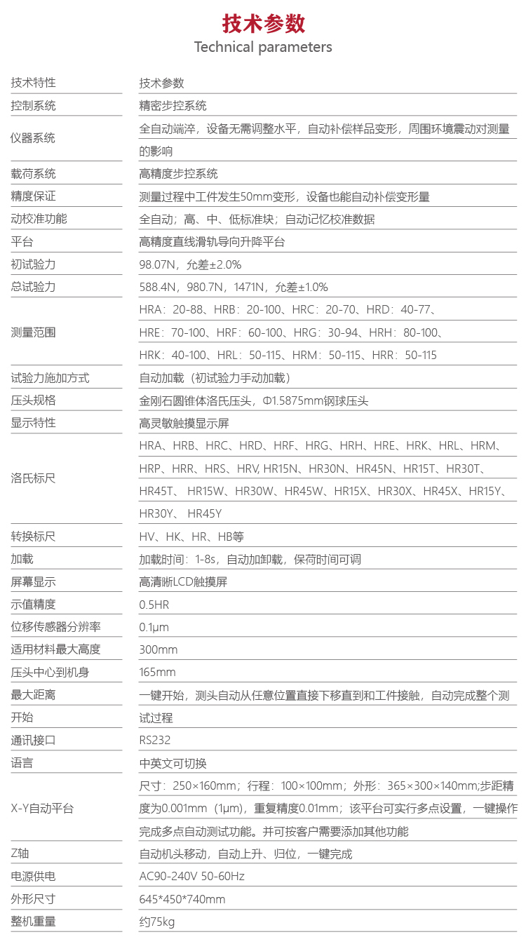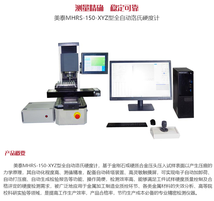 美泰MHRS-150-XYZ型全自動洛氏硬度計,基于金剛石或硬質(zhì)合金壓頭壓入試樣表面以產(chǎn)生壓痕的力學原理,其自動化程度高、測值精準,配備自動轉(zhuǎn)塔裝置、高靈敏觸摸屏,可實現(xiàn)電子自動加卸荷、自動打壓痕、自動生成檢驗報告等功能,操作簡便,檢測效率高,能夠滿足工件試樣硬度質(zhì)量控制及合格評定的硬度檢測需求,被廣泛地應用于金屬加工制造業(yè)質(zhì)控環(huán)節(jié)、各類金屬材料的失效分析、高等院??蒲袑嶒灥阮I域,是提高工作生產(chǎn)效率,產(chǎn)品合格率,節(jié)約生產(chǎn)成本必備的專業(yè)精密檢測儀器。