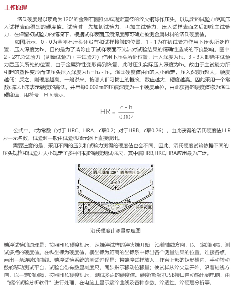 洛氏硬度檢測是以頂角為120°的金剛石圓錐體或規(guī)定直徑的淬火鋼球作為壓頭,以規(guī)定的試驗力將其壓入試樣表面,根據(jù)試樣表面壓痕深度以評定被測金屬材料的洛氏硬度值。