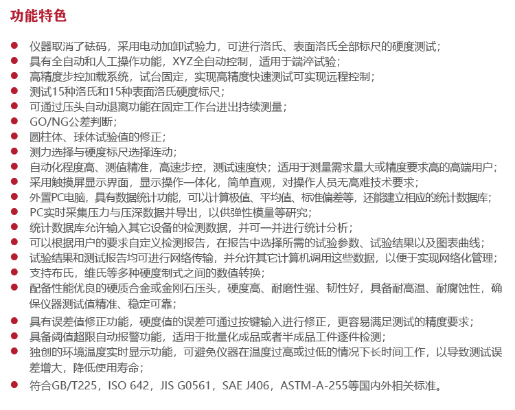 儀器特點?儀器取消了砝碼,采用電動加卸試驗力,可進行洛氏、表面洛氏全部標尺的硬度測試;