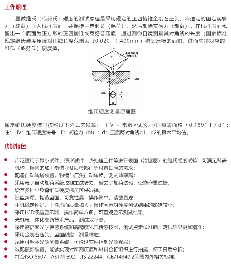符合ISO 6507、ASTM E92、JIS Z2244、GB/T4340.2等國內(nèi)外相關(guān)標(biāo)準(zhǔn)。