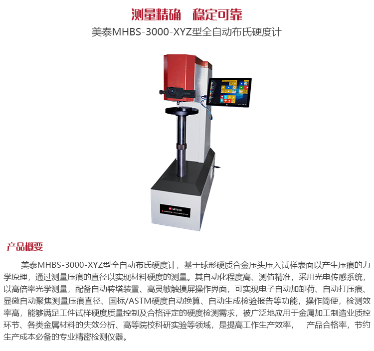 產品概述美泰MHBS-3000-XYZ型全自動布氏硬度計,基于球形硬質合金壓頭壓入試樣表面以產生壓痕的力學原理,通過測量壓痕的直徑以實現(xiàn)材料硬度的測量。其自動化程度高、測值精準,采用光電傳感系統(tǒng),以高倍率光學測量,配備自動轉塔裝置、高靈敏觸摸屏操作界面,可實現(xiàn)電子自動加卸荷、自動打壓痕、顯微自動聚焦測量壓痕直徑、國標/ASTM硬度自動換算、自動生成檢驗報告等功能,操作簡便,檢測效率高,能夠滿足工件試樣硬度質量控制及合格評定的硬度檢測需求,被廣泛地應用于金屬加工制造業(yè)質控環(huán)節(jié)、各類金屬材料的失效分析、高等院??蒲袑嶒灥阮I域,是提高工作生產效率,產品合格率,節(jié)約生產成本必備的專業(yè)精密檢測儀器。