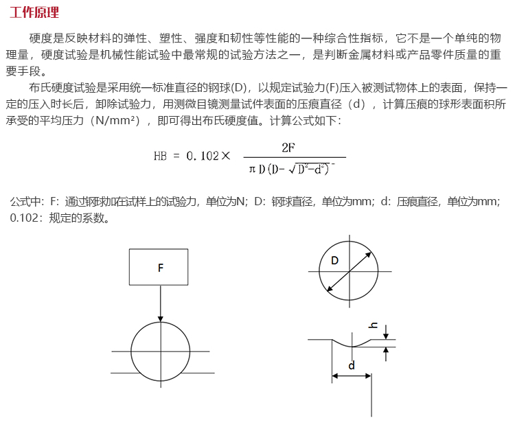 工作原理布氏硬度試驗是采用統(tǒng)一標準直徑的鋼球(D)壓頭,以規(guī)定試驗力(F)壓入被測試件表面,保持一定的壓入時長后,卸除試驗力,用測微目鏡測量試件表面的壓痕直徑(d),以計算壓痕的球形表面積所承受的平均壓力(N/mm2),即可得出布氏硬度值。計算公式如下: