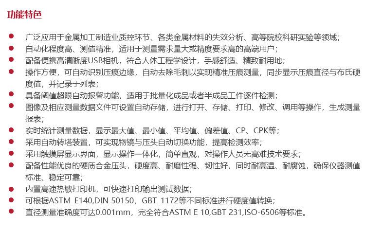 直徑測量準確度可達0.001mm,完全符合ASTM E 10,GBT 231,ISO-6506等標準;