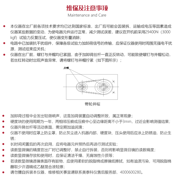 儀器的保養(yǎng)與維護本儀器在出廠前各項技術要求均已達到國家標準,出廠后可能會因裝拆、運輸或電壓等因素造成儀器某些數(shù)據的變動,為使電器元件運行正常,減少測試誤差,建議在開機前采用29400N(3000kgf)試驗力反復壓試,使儀器變形量消除;