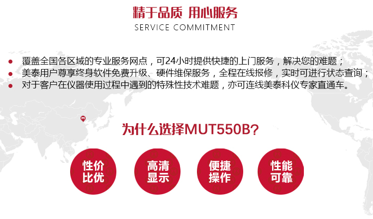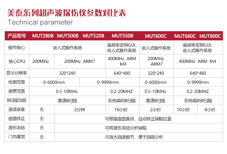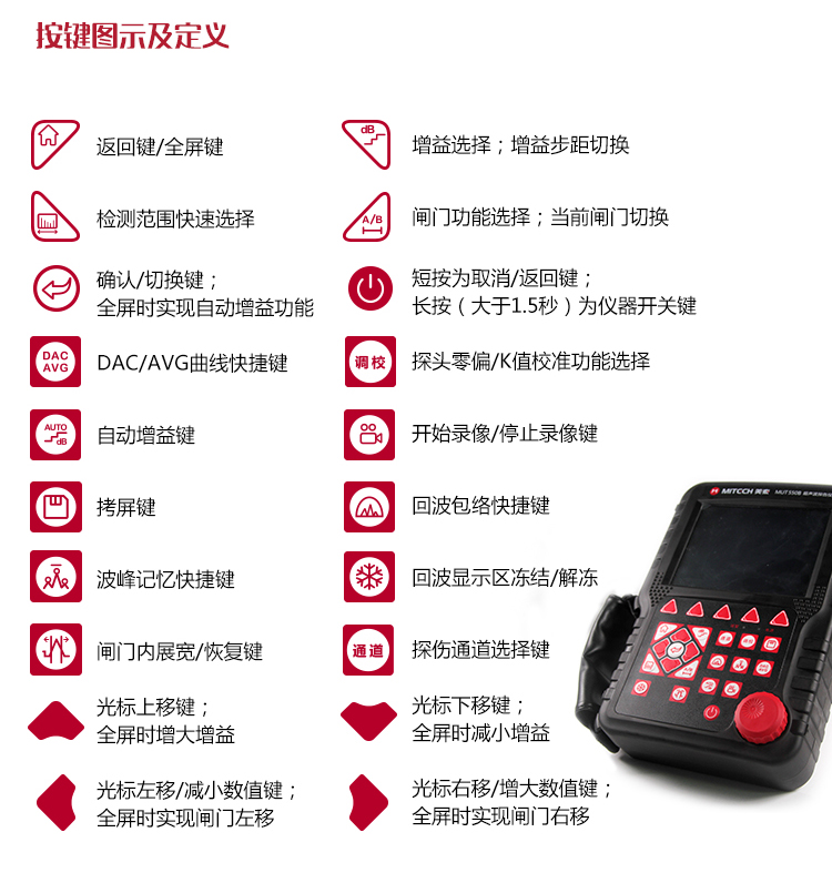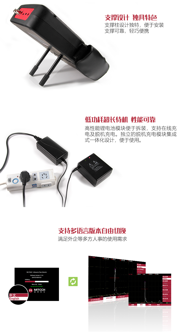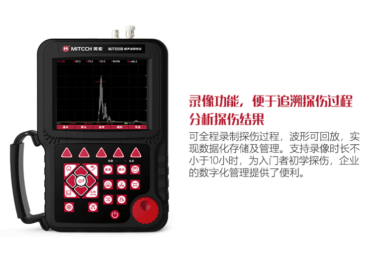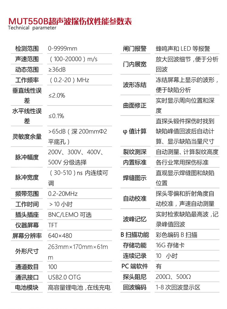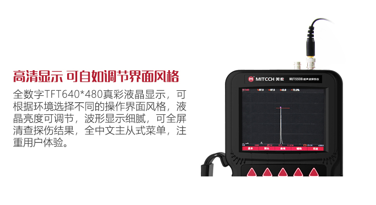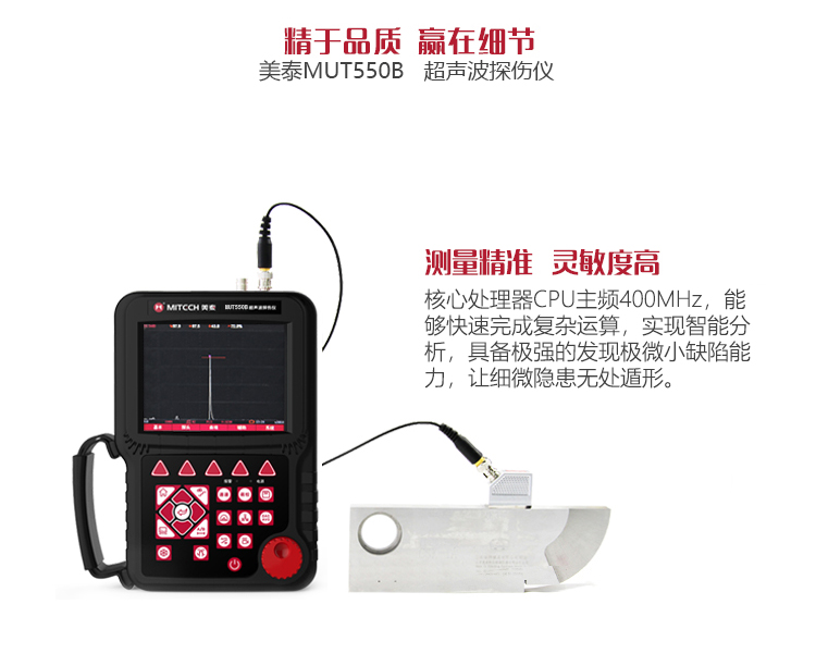 產(chǎn)品概述MUT550B數(shù)字式超聲波探傷儀依據(jù)超聲傳播原理,可精準、靈敏地進行工件內(nèi)部多種缺陷(裂紋、夾雜、氣孔等)的檢測、定位、評估和診斷。采用全數(shù)字TFT640×480真彩色液晶顯示屏,在光線昏暗及日光強烈環(huán)境下都能為您呈現(xiàn)清晰缺陷;0-9999mm大量程可滿足制造業(yè)、鋼鐵冶金業(yè)、金屬加工業(yè)、化工業(yè)等常規(guī)的缺陷檢測需求;低功耗設(shè)計配備大容量高性能鋰離子電池模塊可連續(xù)工作10小時以上;全中文主從式菜單,注重用戶體驗,集快捷按鍵、數(shù)碼飛梭旋輪、十字菜單三種操作方式于一體,不同使用習慣均可操作自如;設(shè)有綜合性能指標自檢功能,可自動生成測試報告,支持多語言。該產(chǎn)品具有很高的性價比,是實用經(jīng)濟款超聲檢測儀器的明智之選。