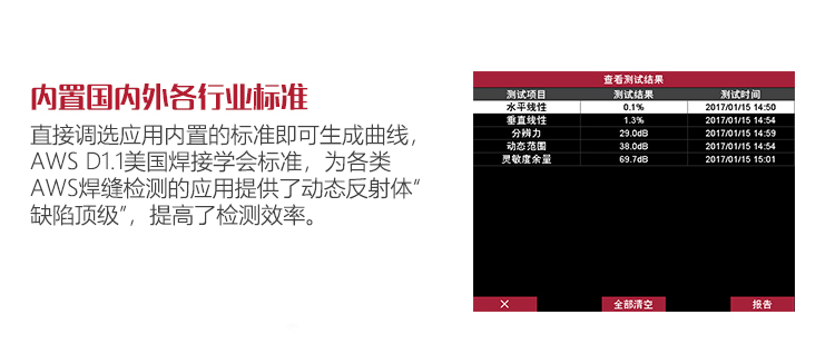 | AWS D1.1 | 美國焊接學會標準,為各類AWS焊縫檢測應用提供一個動態(tài)反射體“缺陷定級”。可避免手工計算,提高檢測效率。(可選) |