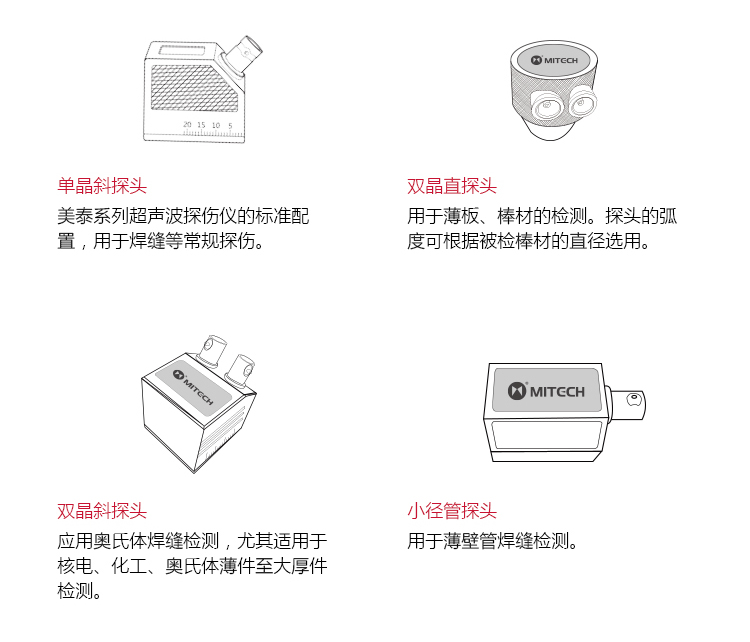| 探頭類型 | 直探頭、斜探頭、雙晶探頭、穿透探頭 |