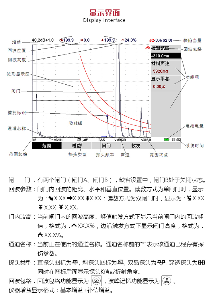 | 回波編碼 | 以不同顏色顯示1~6次回波顯示區(qū),更好的區(qū)分一次波、二次波,便于判斷缺陷位置 |