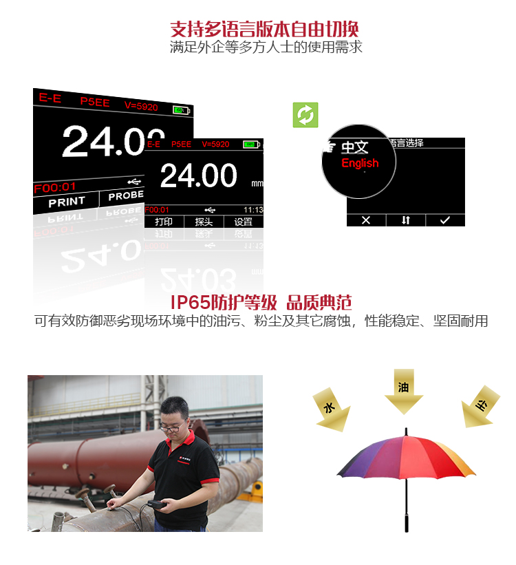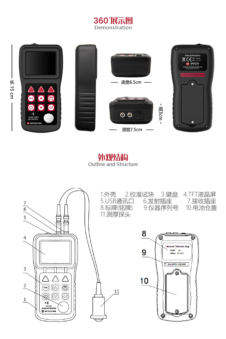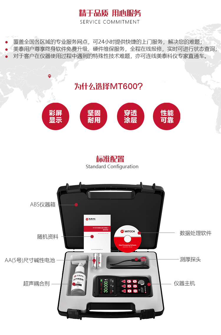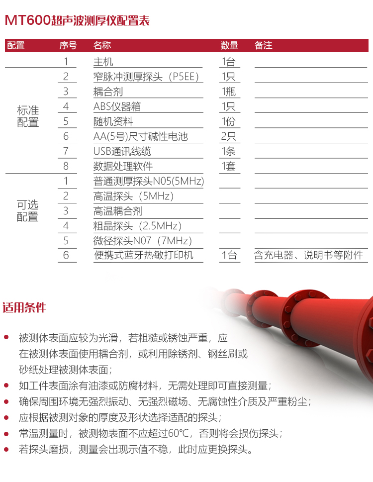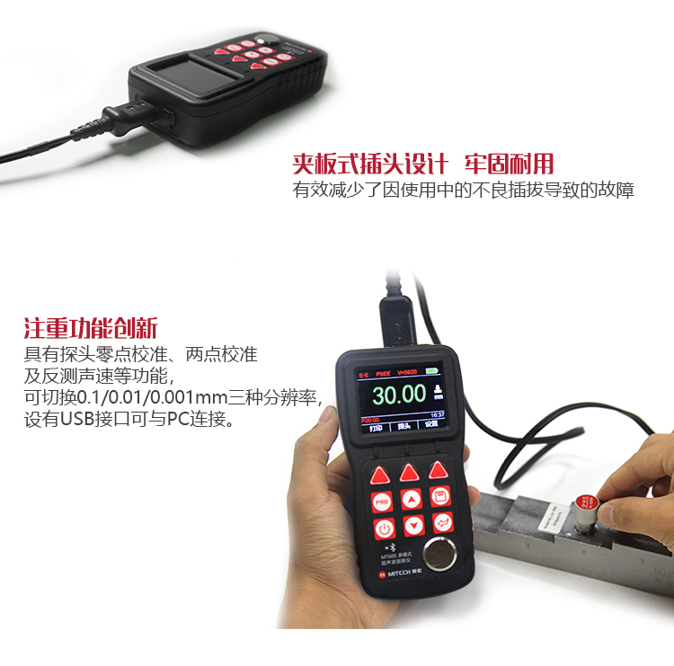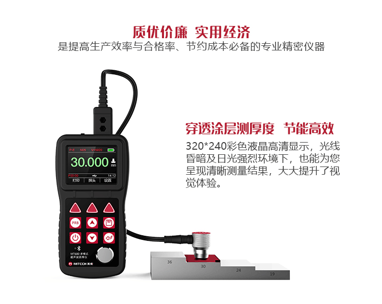 產(chǎn)品概述MT600超聲波測(cè)厚儀是美泰公司強(qiáng)力推出的升級(jí)產(chǎn)品,它更加注重用戶(hù)體驗(yàn)及功能創(chuàng)新,采用320×240彩色液晶顯示屏,光線昏暗及日光強(qiáng)烈環(huán)境下也能為您呈現(xiàn)清晰測(cè)量結(jié)果,大大提升了視覺(jué)體驗(yàn),IP65防護(hù)等級(jí),可有效防御惡劣現(xiàn)場(chǎng)環(huán)境中的油污、粉塵及其它腐蝕;創(chuàng)新設(shè)計(jì)的語(yǔ)言播報(bào)測(cè)量結(jié)果功能,可方便讀數(shù),超出設(shè)定范圍可自動(dòng)報(bào)警,滿(mǎn)足高效采集材料多點(diǎn)厚度的精準(zhǔn)檢測(cè)需求,支持0.001高精度顯示、藍(lán)牙通訊,兼?zhèn)浯┩竿繉幽J脚c普通模式雙效功能,其獨(dú)特的可穿透涂層測(cè)厚度的性能為表面涂有油漆或防腐材料的工件厚度檢測(cè)提供了更加高效的解決方案,測(cè)量前無(wú)需處理掉表面的涂層,可直接測(cè)量。被廣泛應(yīng)用于石油、化工、冶金、造船、航空、航天等領(lǐng)域的生產(chǎn)設(shè)備中各種管道及壓力容器腐蝕減薄程度的監(jiān)測(cè),也可用于對(duì)各種板材及各種加工零件做精確的測(cè)量。是提高生產(chǎn)效率與合格率、節(jié)約成本必備的專(zhuān)業(yè)精密儀器。