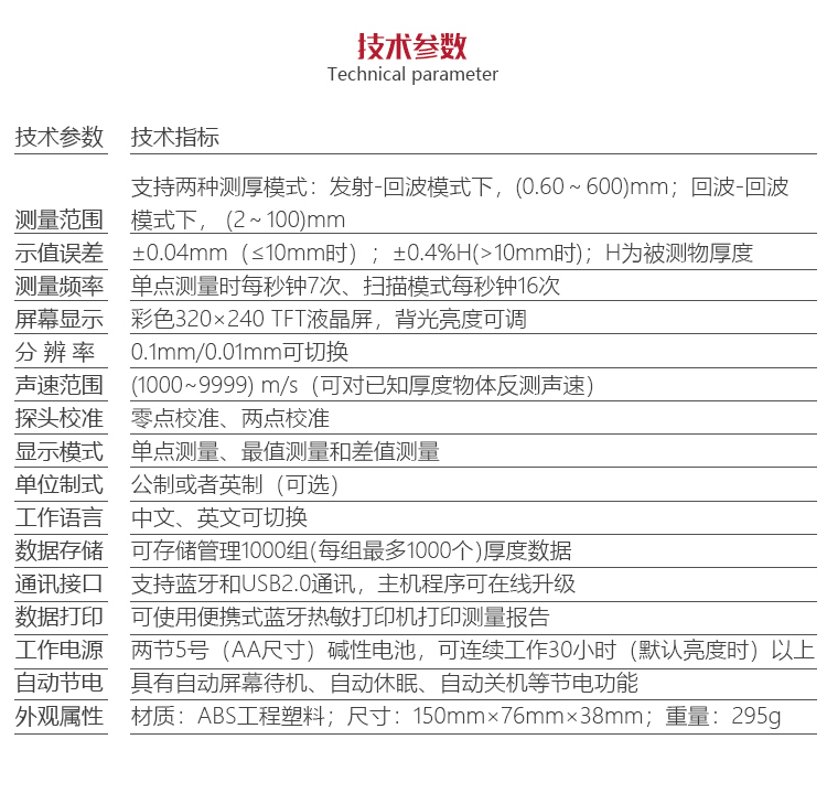 可存儲(chǔ)管理100組(每組最多100個(gè))厚度數(shù)據(jù),支持藍(lán)牙和USB2.0通訊,主機(jī)程序可在線升級(jí)