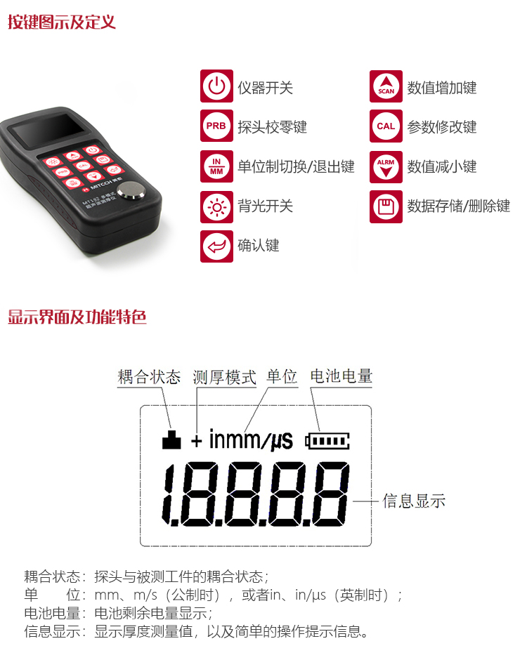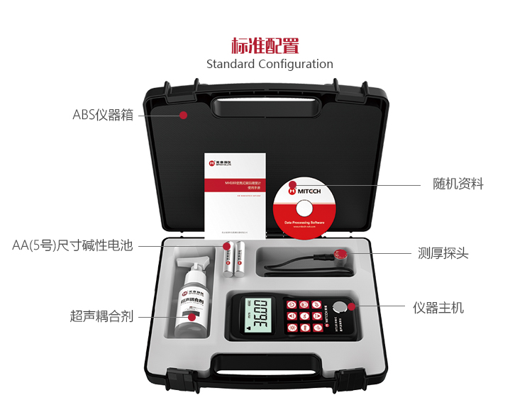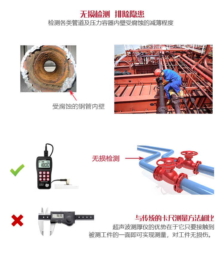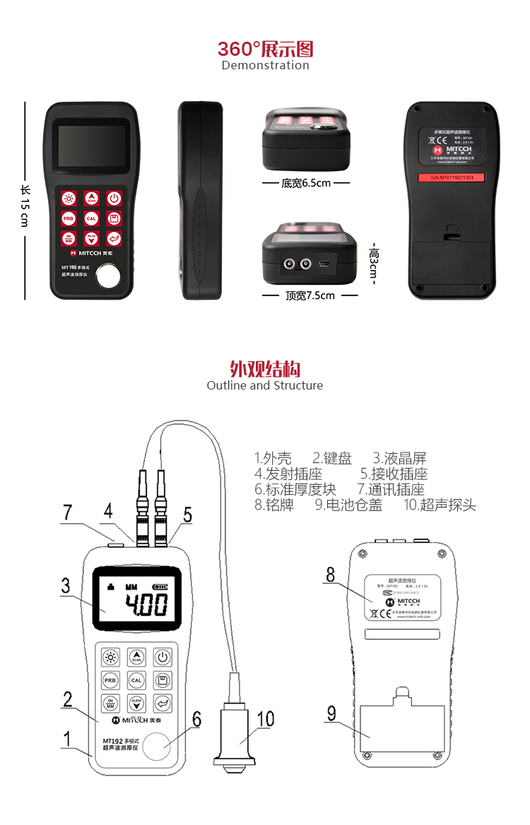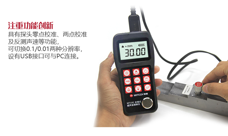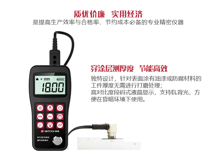 產品概述美泰MT192超聲波測厚儀,基于超聲波測量原理,可對金屬、塑料、陶瓷、玻璃及其他多種超聲波的良導體材料進行厚度測量,也可實現(xiàn)對材料聲速的反測。與傳統(tǒng)的測量方法相比,超聲波測厚儀的優(yōu)勢在于它只要接觸到被測工件的一面即可完成測量,其獨特的可穿透涂層測厚度的性能為表面涂有油漆或防腐材料的工件厚度檢測提供了更加高效的解決方案,測量前無需處理掉表面的涂層,可以直接測量。被廣泛應用于石油、化工、冶金、造船、航空、航天等領域的生產設備中各種管道及壓力容器腐蝕減薄程度的監(jiān)測,也可用于對各種板材及各種加工零件做精確的測量。是提高生產效率與合格率、節(jié)約成本必備的專業(yè)精密儀器。