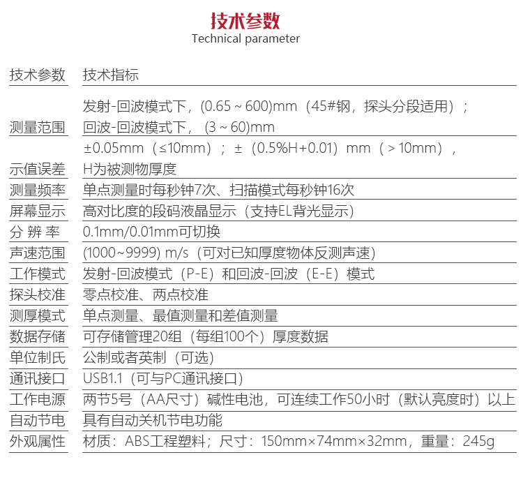 | 測厚模式 | 發(fā)射-回波模式(P-E)和回波-回波(E-E)模式 |