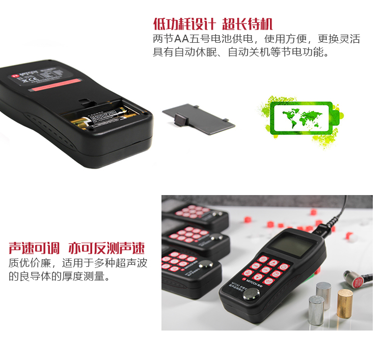 | 美泰系列超聲波測厚儀,均采用低功耗設計理念,超長待機,MT150/MT160/MT200/MT180/MT192/MT280/MT600/MT660均由兩節(jié)AA五號電池供電、更換方便。 | |