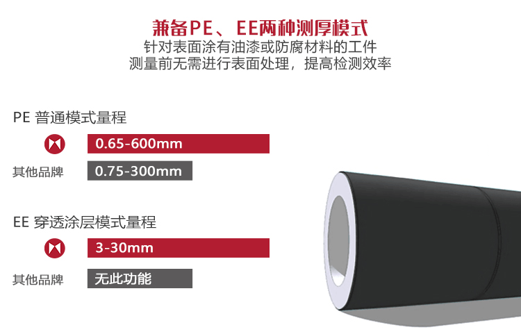 具有兩種測厚模式:發(fā)射-回波模式和回波-回波模式,可以穿透涂層進(jìn)行厚度測量而不計(jì)入涂層厚度