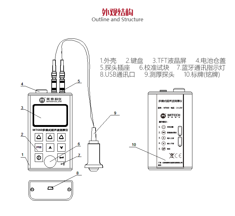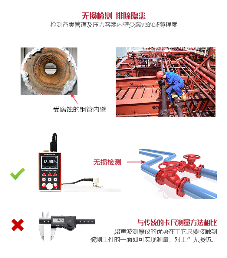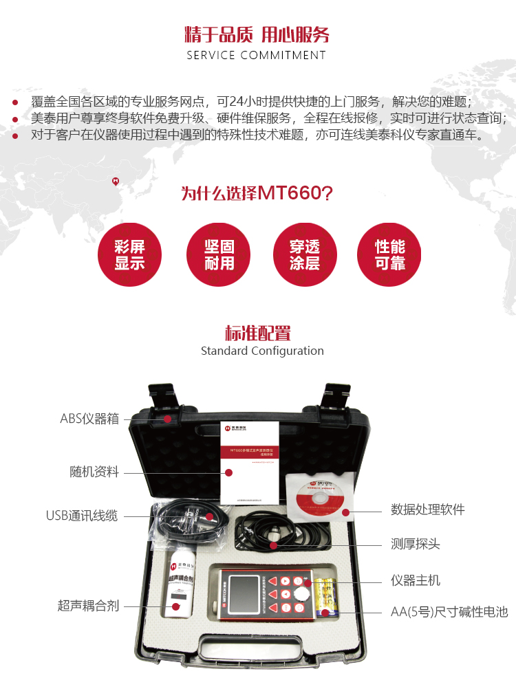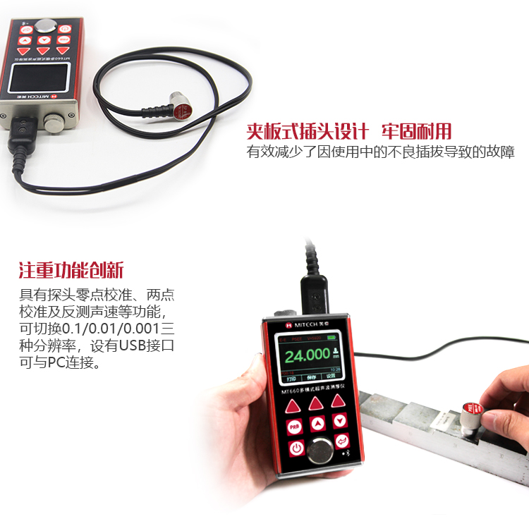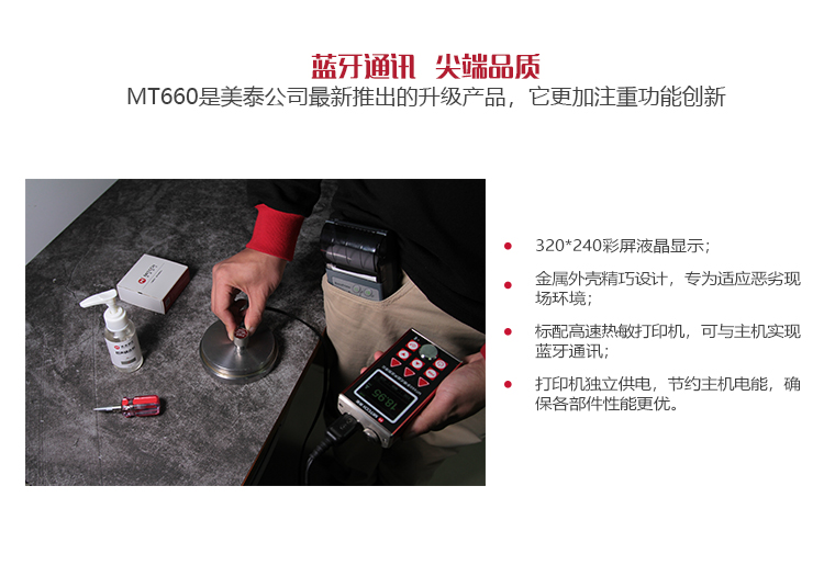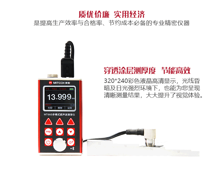 產(chǎn)品概述MT660超聲波測厚儀是美泰公司最新推出的升級產(chǎn)品,它更加注重用戶體驗(yàn)及功能創(chuàng)新,采用320×240彩色液晶顯示屏,光線昏暗及日光強(qiáng)烈環(huán)境下也能為您呈現(xiàn)清晰測量結(jié)果,大大提升了視覺體驗(yàn),密封的鋁美合金外殼精巧設(shè)計(jì),體積更小、品質(zhì)更優(yōu),專為防御惡劣現(xiàn)場環(huán)境中的油污、粉塵而設(shè)計(jì);智能化警示功能,超出設(shè)定范圍可自動提示,可方便讀數(shù),滿足高效采集材料多點(diǎn)厚度的精準(zhǔn)檢測需求,支持0.001高精度顯示、藍(lán)牙通訊,兼?zhèn)浯┩竿繉幽J脚c普通模式雙效功能,其獨(dú)特的可穿透涂層測厚度的性能為表面涂有油漆或防腐材料的工件厚度檢測提供了更加高效的解決方案,測量前無需處理掉表面的涂層,直接亦可測量。被廣泛應(yīng)用于石油、化工、冶金、造船、航空、航天等領(lǐng)域的生產(chǎn)設(shè)備中各種管道及壓力容器腐蝕減薄程度的監(jiān)測,也可用于對各種板材及各種加工零件做精確的測量。是提高生產(chǎn)效率與合格率、節(jié)約成本必備的專業(yè)精密儀器。