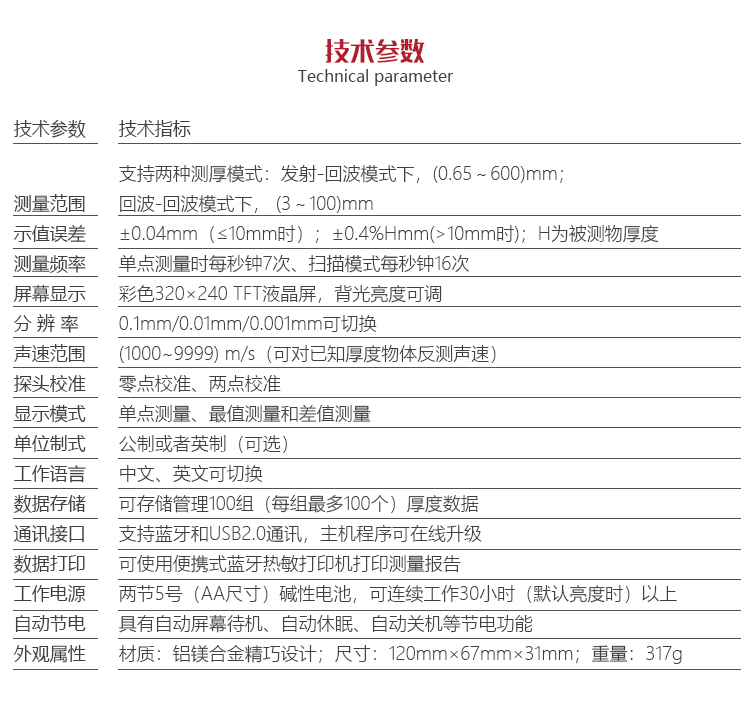 | 存儲 | 可存儲管理100組(每組最多100個(gè))厚度數(shù)據(jù) |