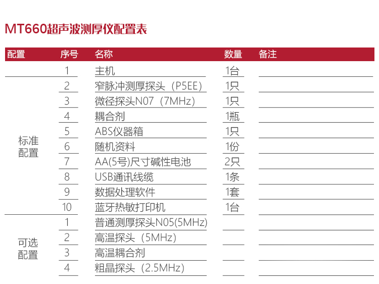 | 探頭直徑 | 測厚探頭NO5直徑10MM、微晶探頭N07直徑6MM、高溫探頭HT5直徑12MM、窄脈沖測厚探頭P5EE直徑10MM、粗晶探頭直徑12MM |