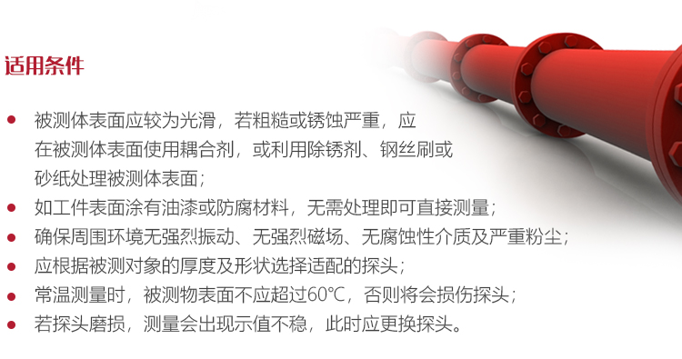 常溫測量時(shí),被測物表面不應(yīng)超過60℃,否則探頭有可能損壞。如果被測物表面溫度超過60℃,則應(yīng)選擇使用高溫探頭和高溫耦合劑(見表1.2 :探頭技術(shù)參數(shù));