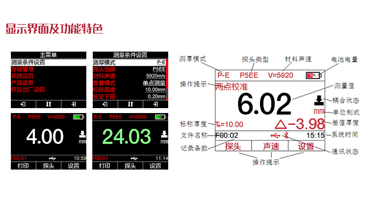 | 測厚模式 | 發(fā)射-回波模式(P-E)和回波-回波(E-E)模式 |