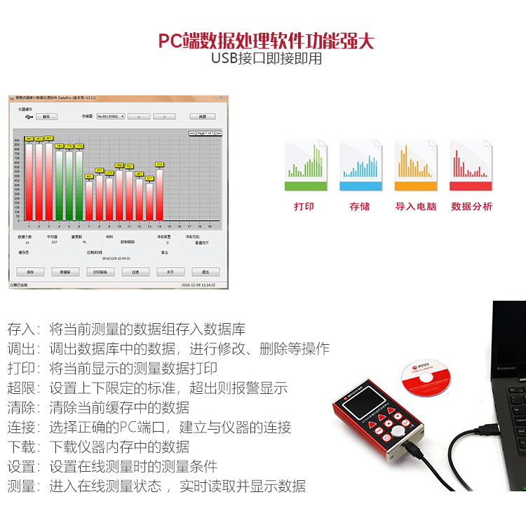 附帶USB數(shù)據(jù)處理軟件,可連接電腦進(jìn)行數(shù)據(jù)分析、存儲、打印等
