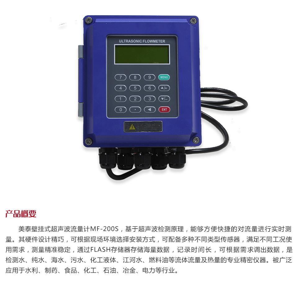 產(chǎn)品概述美泰壁掛式超聲波流量計(jì)MF-200S,基于超聲波檢測(cè)原理,能夠方便快捷的對(duì)流量進(jìn)行實(shí)時(shí)測(cè)量。其硬件設(shè)計(jì)精巧,可根據(jù)現(xiàn)場(chǎng)環(huán)境選擇安裝方式,可配備多種不同類(lèi)型傳感器,滿足不同工況使用需求,測(cè)量精準(zhǔn)穩(wěn)定,通過(guò)FLASH存儲(chǔ)器存儲(chǔ)海量數(shù)據(jù),記錄時(shí)間長(zhǎng),可根據(jù)需求調(diào)出數(shù)據(jù),是檢測(cè)水、純水、海水、污水、化工液體、江河水、燃料油等流體流量及熱量的專(zhuān)業(yè)精密儀器。被廣泛應(yīng)用于水利、制藥、食品、化工、石油、冶金、電力等行業(yè)。
