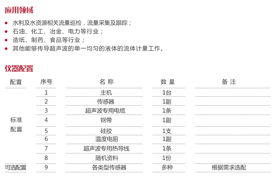 | 流體種類(lèi) | 水、海水、污水、酸堿液、酒精、啤酒、各種油類(lèi)等能傳導(dǎo)超聲波的單一均勻液體 |
